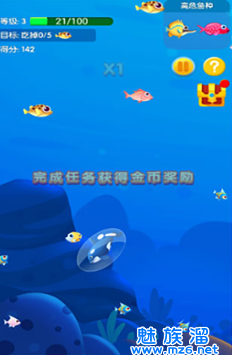 在游戏中会有形形色色大小不一的鱼儿在深海中游荡,需要玩家控制小虎鲸鱼吞掉比自己小的鱼,同时躲避比自己大的鱼,以此获得更多的分数以及金币。玩家获得的金币可以用来兑换水族馆里的鱼儿以及深海装饰品。通过游戏,培养了玩家乐观进取的精神。