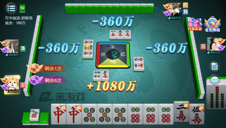 6、赢牌:点炮一家负,自摸赢三家。点炮者只需要支付自己输的金额(只有点炮的跟赢家)其他两家不对杠牌有任何支出/收入7、杠牌:抢杠和胡牌算自摸,(可以抢杠即杠牌其他家可以胡)。