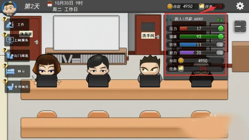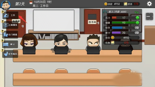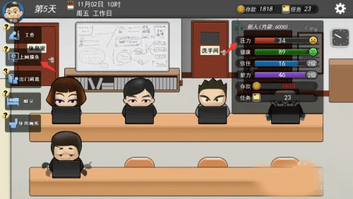 4、上网摸鱼:可减少压力值,但需避开老板视线,否则会被扣信任度。