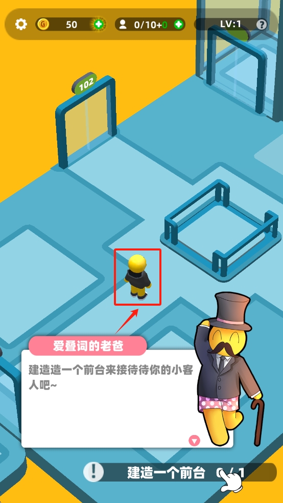 2、跟随游戏指引,点击角色以建造前台,接待小客人。