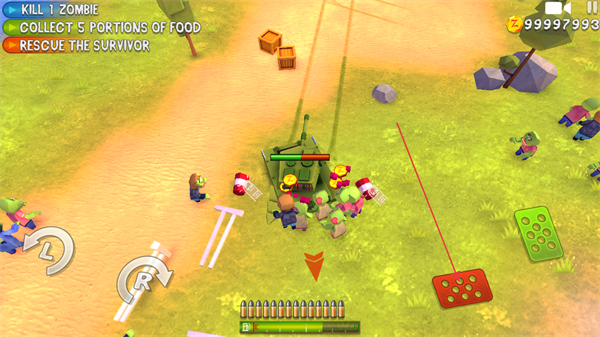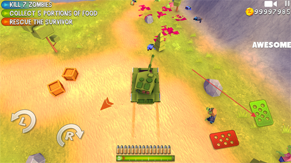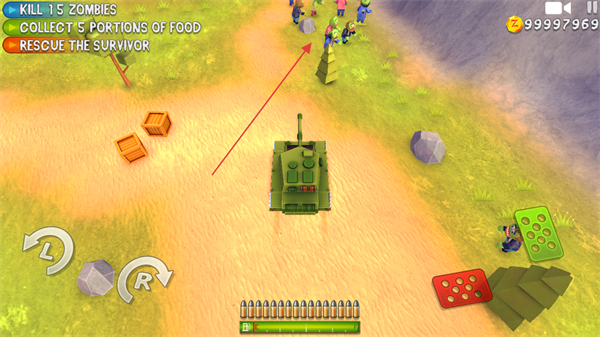 操控坦克前进,碰到僵尸群就展开攻击,消灭僵尸以推进任务进度。