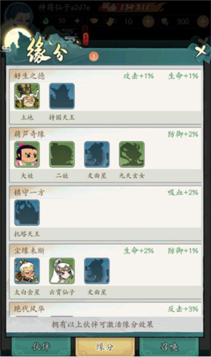 与特定伙伴达成组合可缔结缘分,缘分能为道友提供永久的属性增益。