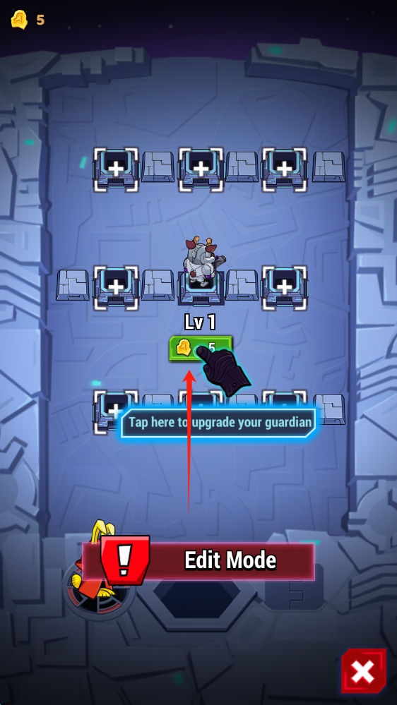 在升级界面中,点击对应的指定位置,消耗相应数量的金币,将Lv-1守卫进行升级,以此提升它的属性和能力,最后点击升级按钮即可完成操作。