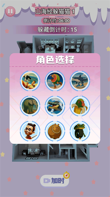 在角色挑选界面选择特殊外观的角色(如鲨鱼造型、香蕉猴造型等),利用好15秒的躲藏准备时间,在6分钟倒计时开始前完成所有前期准备工作。
