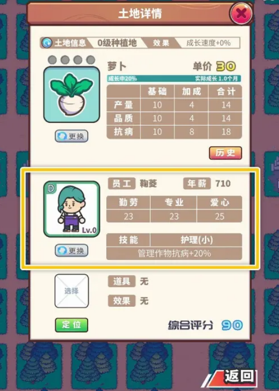 接下来在“土地详情”窗口里,点击下方的【选择】按钮,为这块土地挑选合适的员工。