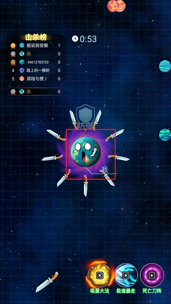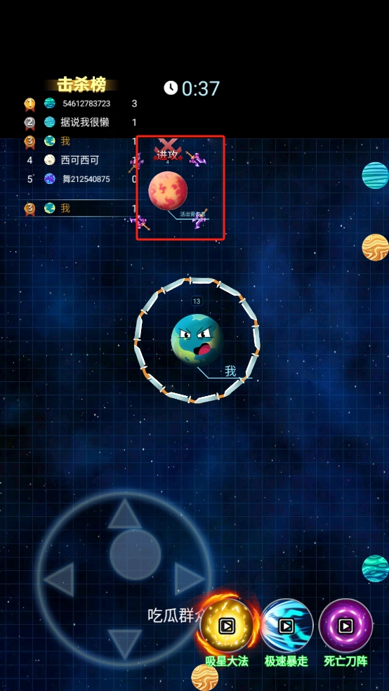 1. 在战斗阶段,对红框里带有刀阵的星球进行操控,利用防御状态来抵挡攻击,抓住合适时机施展吸星大法等技能,进而夺取周边星球的资源。