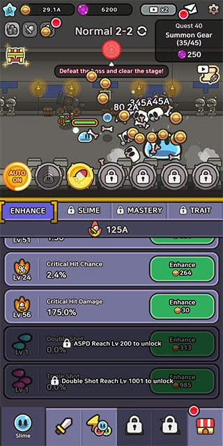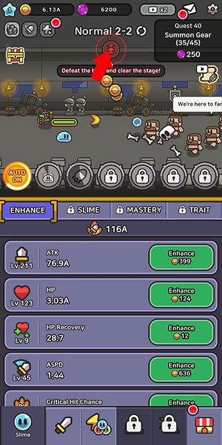 使用金币提升技能等级、增强角色装备属性,助力史莱姆提升战斗力。