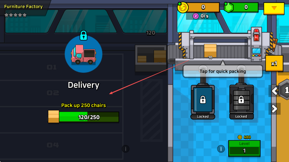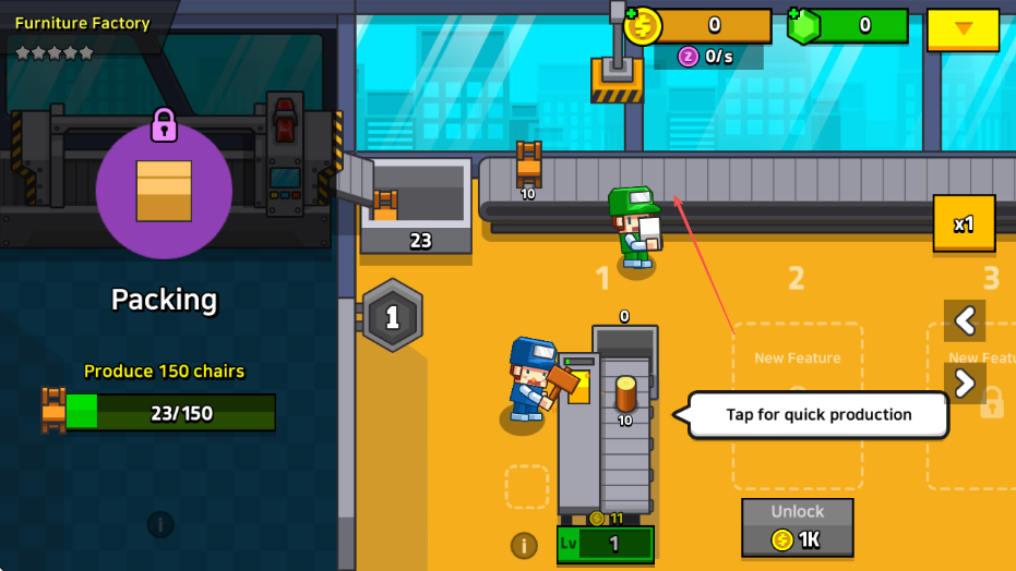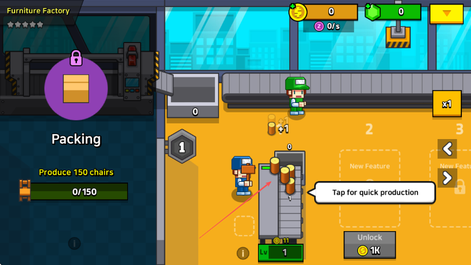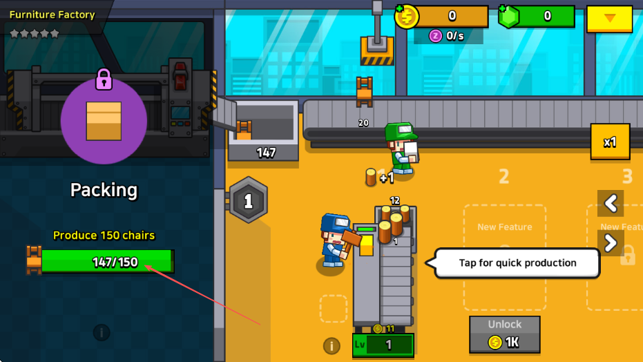 1. 来到游戏“Furniture Factory”的界面,看清任务为“Produce150chairs”,接着点击工人以加速椅子的生产。