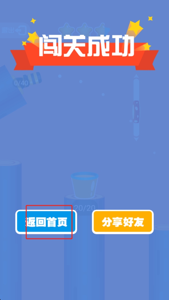 3、当关卡胜利后,界面会弹出闯关成功的提示。若玩家想要回到游戏初始界面,只需点击返回首页按钮,就能够重新选择关卡或者开启新的挑战。
