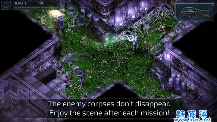 3、在你击杀掉敌人后在一段时间内敌人的尸体是不会消失的,你将会看到众多外星生物群的尸体在你的周围,如果没有快速击杀你就会被其吞噬。