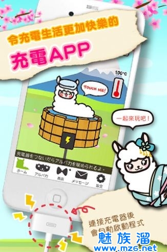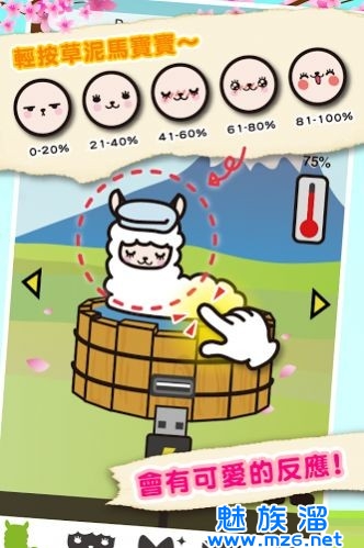 将手机充电可令温泉水加热,让浸泡在温泉里的草泥马身体回暖后,便可以诞生一只属于自己的草泥马宝宝了!连接充电器后会自动启动程式;