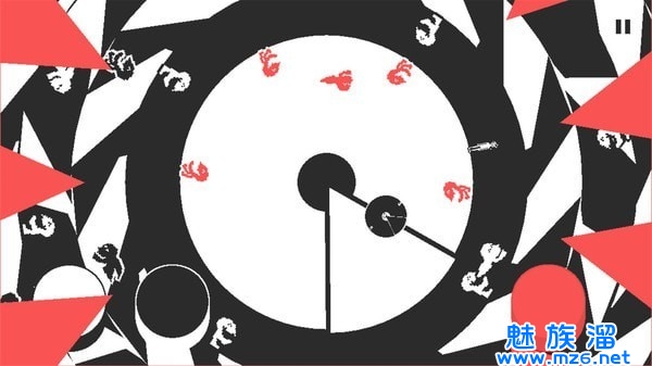 与此同时还会有锯齿状的尖刺开始不断向大圆圈的中心旋转,当旋转到一定程度碰到小人就game over,因此需要控制小人在跳过尖刺和小怪物的同时,及时开始新一轮跑动按确认键跳上小圆圈。