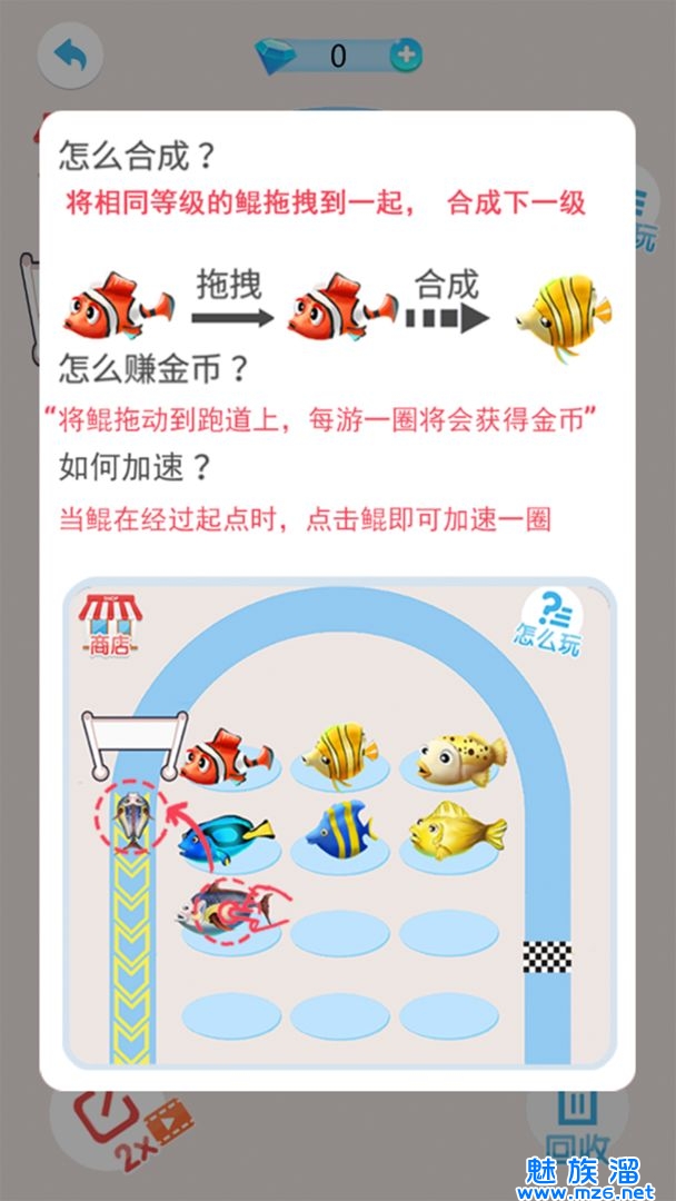 玩家在游戏中通过合成使鱼游得更快更快,然后才能得到新的鱼,最终完成坤的进化