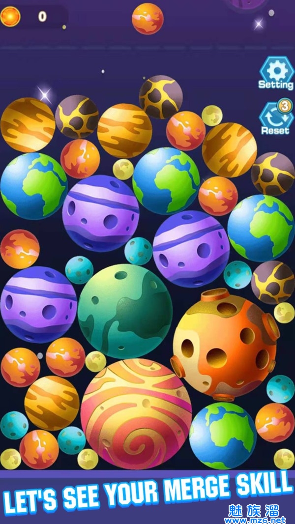 2、快速的进行消除挑战,利用到不同星球的合成方式,不断的消除合成更大的星球获取分数。