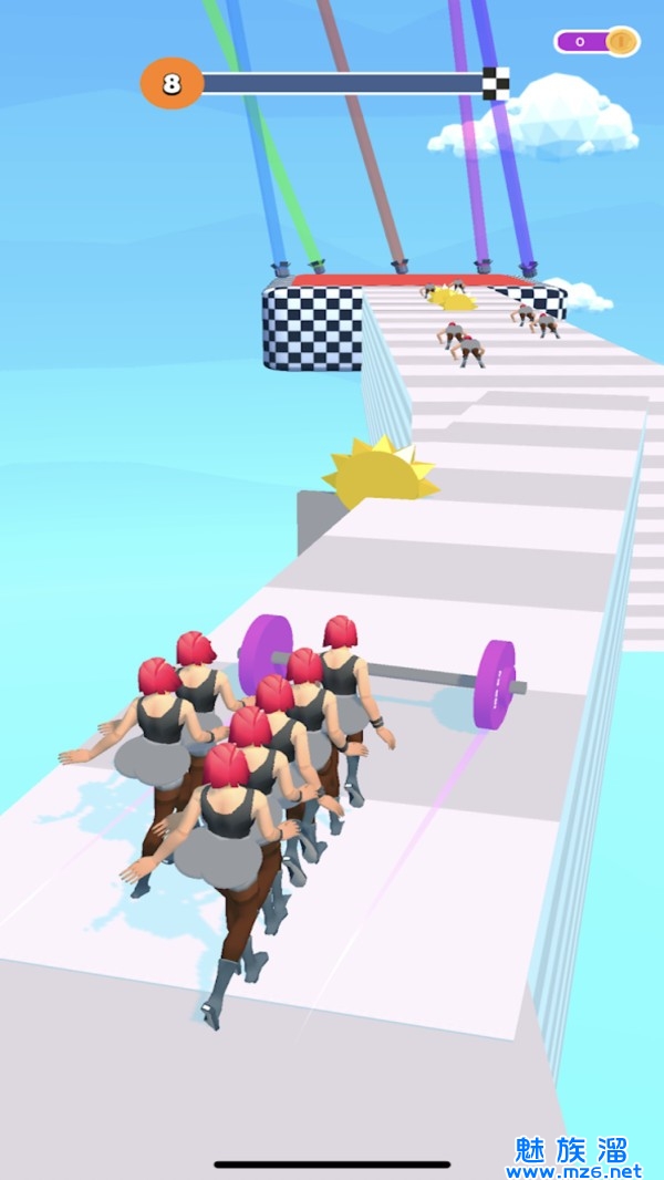 完美冲冲冲游戏是一款休闲跑酷游戏,玩家在游戏里只需要在关卡中疯狂跑跑跑,然后只管冲冲冲,通过将杠铃压过躺在地板上的人来收集他们加入自己的阵营,一定要时刻注意路上的陷阱和尖锐无比的障碍物,他们就是阻挠你成功的绊脚石,一定要保护自己的人群,防止他们变小,否则获得的奖励就会变少。