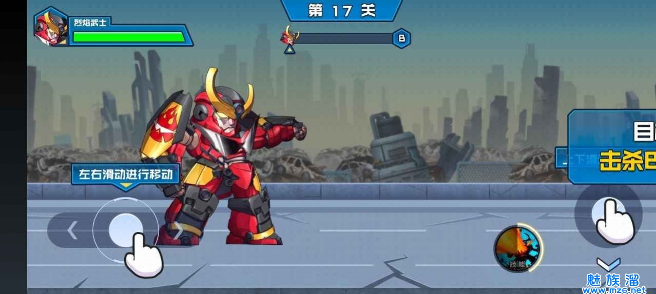 2、左右滑动机甲开始移动,在面对敌人时使用技能即可对敌造成伤害。