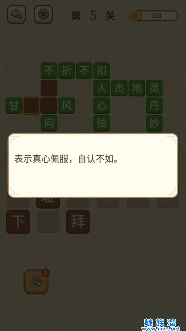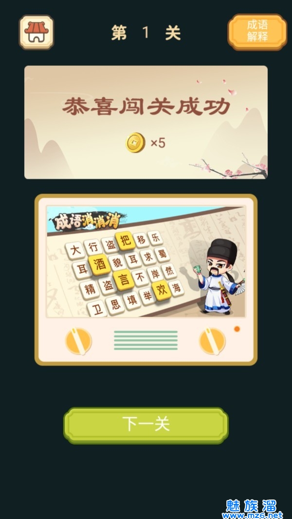 就能花费少量金币购买待填入的所有成语解释,通过解释启发玩家再次思考答案;“提示”工具即玩家可以在花费金币以后直
