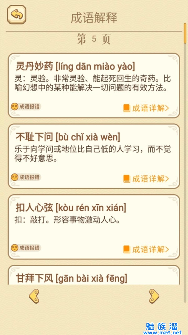 成千上万个没有用过的成语被挑选出来测试玩家,每个成语的意思都有相应的解释。