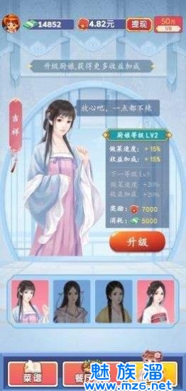 聘请厨师进行工作,手艺随着等级的提升增加,得到的食物更加优质。