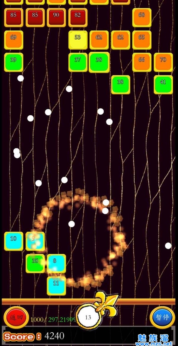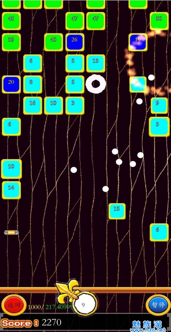 3.每次弹珠击打一次方块都会获得分数,在方块到达底端前尽可能的获取高分。