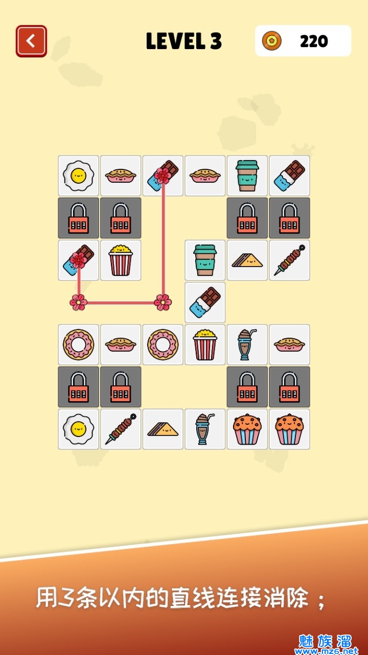 您必须找到两个图标相同的图块,它们最多可以连接3条直线。