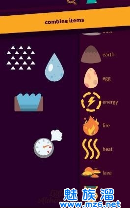 你会看到右侧最基本的三个元素水、火、大地。。。将它们拖到左侧的区域,然后将你认为会起反应的两个元素叠加在一起,如果正确的话,就会产生出新的元素在右侧列表中,以此类推。。。