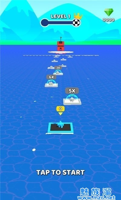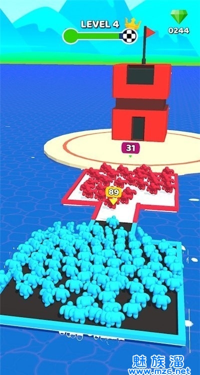 1.控制平台在海上前进左右移动,聚集更多人,避开各种危险障碍物。到达终点后,人群开始与敌人战斗。