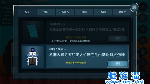我的顺序是先造两个机器人模块,接着造三个太阳能板,两个机器人制造(灰色的机器人)升到两级(如果能量跟不上就先不要升级),太阳能板全部升到两级(金属应该用完了)。