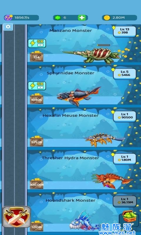 2、玩家可以通过不同的方式去收集金币,有足够的金币就可以随意的购买想要的生物,高等级的海洋生物能力也更强一些哦。