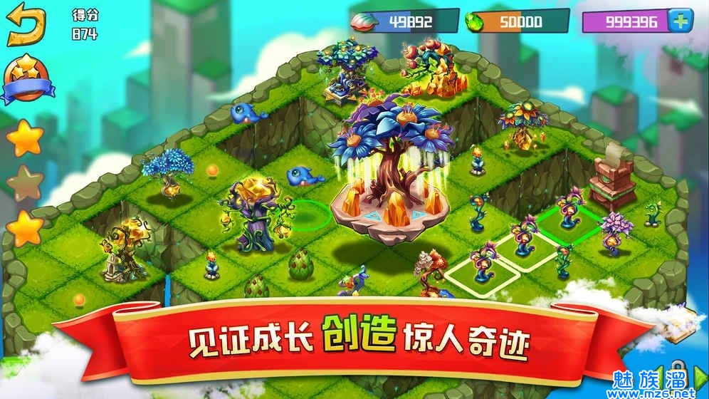 神奇世界在这里,将三个相同物品放在一起就有可能合并他们,你可以合并树木,蘑菇,珊瑚,小草,甚至精灵。每次合成