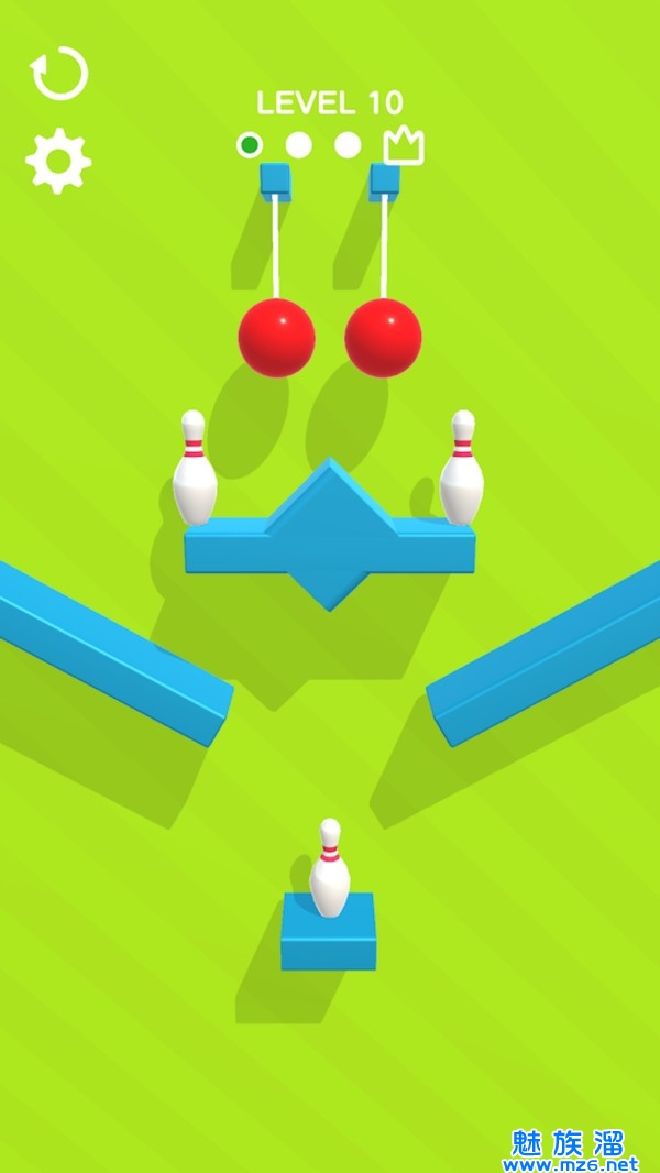 2、游戏中玩家的任务是割掉合适的绳子让保龄球随着重力晃动去击打摆放的球瓶们。
