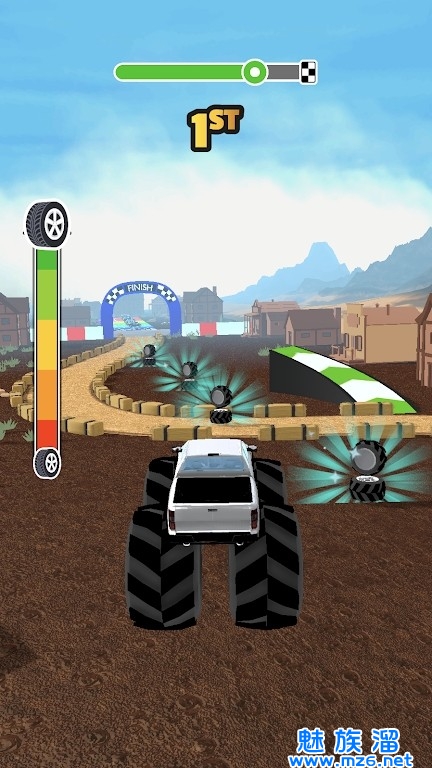 2、赛道上有很多会发光的车轮,收集之后我们的车轮也在变大,可以开的更快。