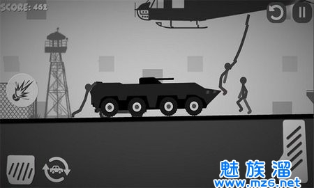 2、在途径的路上会遇到其他火柴人的射击,利用汽车装备的武器将它们击杀。