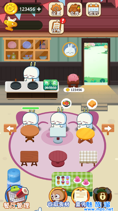 1、游戏的打开方式非常的简单,只需要布置好桌椅,然后点击右下角的宣传;