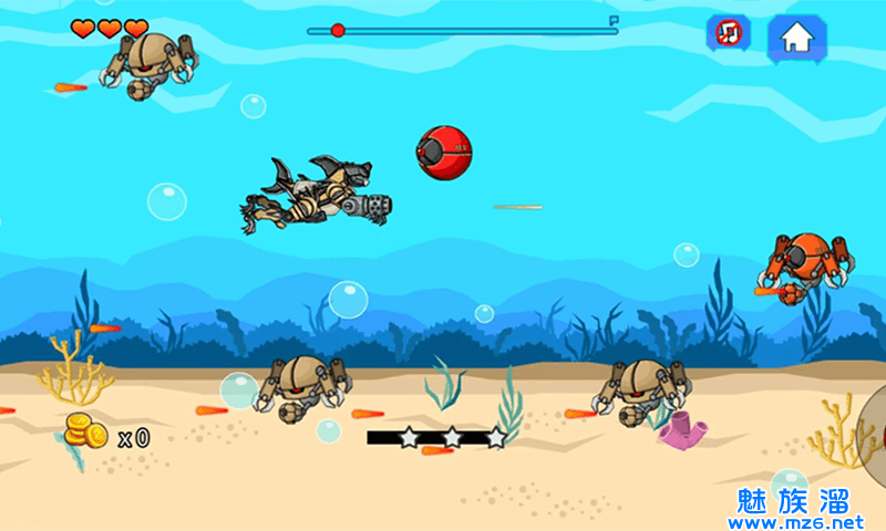 3、在海底之中自由的去进行冒险,不断的移动,去寻找更多的敌人,完成挑战。