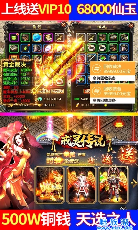 2、上线就送VIP10,68000仙玉,500W铜钱