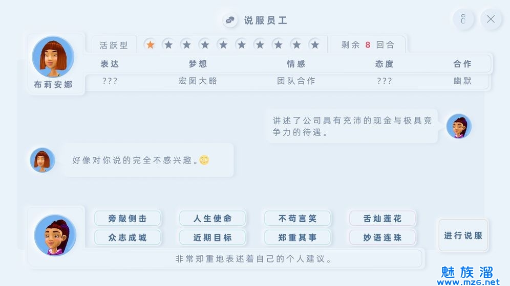 1、游戏中存在大量不断更新的竞争对手,玩家可以和他们友好合作共同发展,也可以为了争夺优秀人才而展开挖人大战。