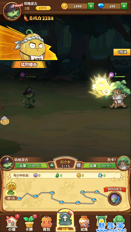 2.挂机的方式打僵尸,不断的升级自己的植物的战力和等级,然后就能解锁更多强大的植物战士了。