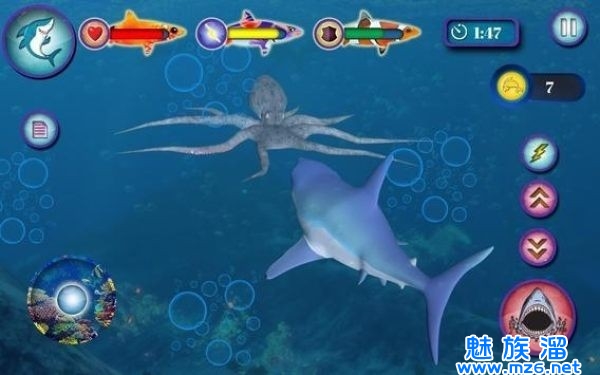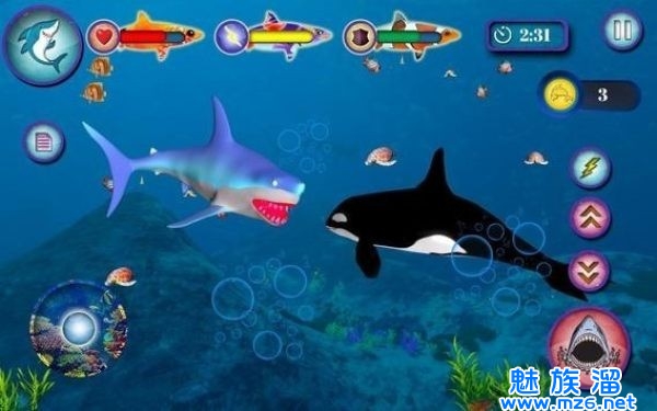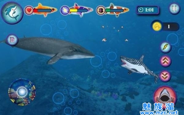 3、在这款游戏中玩家将和你的鲨鱼一起探索这个神秘的海底世界,去捕食更多的海洋生物。