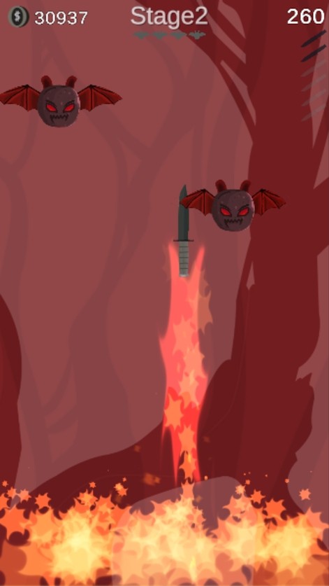1.投掷刀击打蝙蝠,收集金钱并解锁新刀。