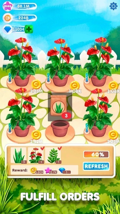 闲置植物花园为玩家们提供了经典的养成合成玩法操作,多样化的娱乐模式更让大家能够尽情的体验到游戏中的多种玩法。积极种植各种各样的花卉植物,出售后就能获得丰厚的收益。还能购买更多的土地来扩大自己的花园面积,种植更多珍稀的品种。更有独特的合成模式让你收获更高级的植物。