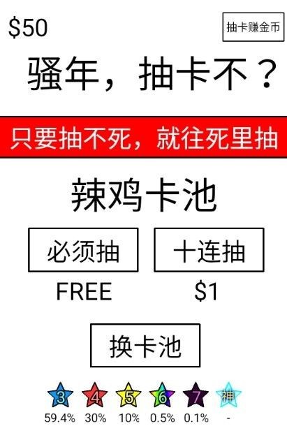 抽卡到S是一款玩起来非常有意思的模拟抽卡类手机游戏,游戏采用了简约的画风,整体画面清晰简约,在这里你可以不断的进行抽卡,获取各种炫酷的武器装备,增强你的属性。游戏的玩法也十分的轻松,你只需要点击抽卡按钮进行抽取即可,非常的简单,感兴趣的玩家快来下载抽卡到S吧!