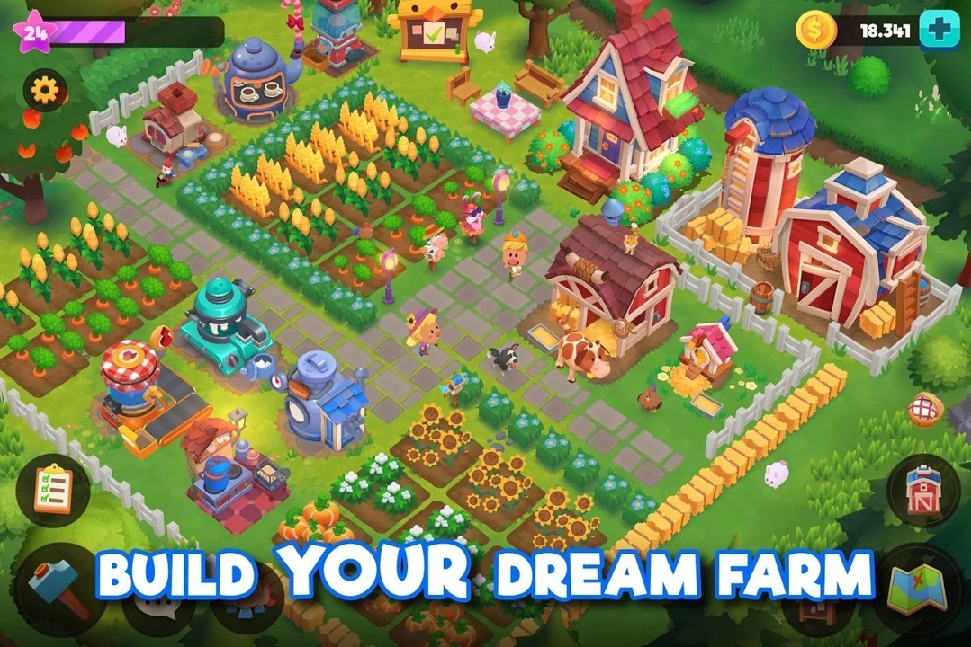 用拖曳的可爱宠物创建并建造您梦想中的农场。
