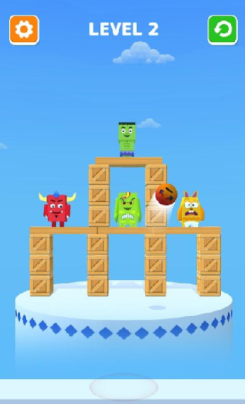 3、滑动屏幕,瞄准要投掷的目标,驱散平台上的木头或小怪物完成关卡。