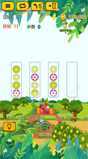 玩家需要将玻璃杯中的水果按照颜色进行分类排序,让不同种类的水果聚集到同一个玻璃杯中。