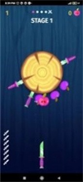 2、将飞刀插入苹果中就能得到分数哦,不过千万不要接触到转盘上面的飞刀,一旦接触到就会导致闯关失败。