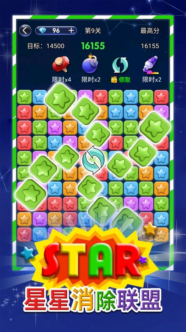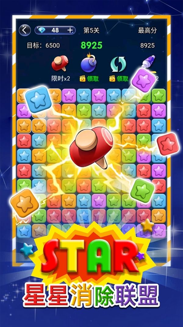 各种不同的内容和玩法,匹配相同颜色的星星越多,消除获得的积分奖励就会越高