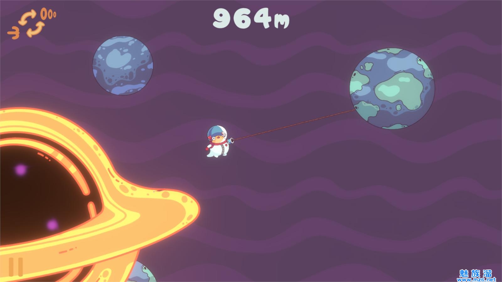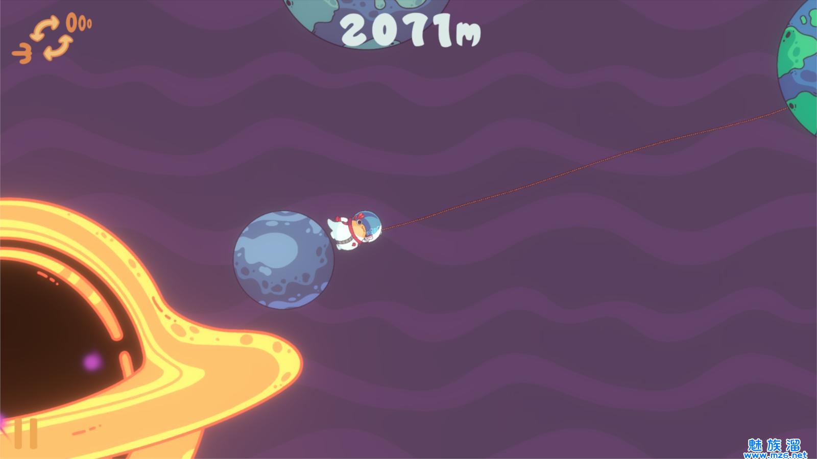 太空的题材充满神秘和玄幻色彩,能够让玩家心生向往,只有掌握好合适的角度和方向,才能够轻松的成功勾住其他星球,挑战性十足,游戏界面显示了玩家已经行动的距离,方便玩家清楚的掌握前进的方向。