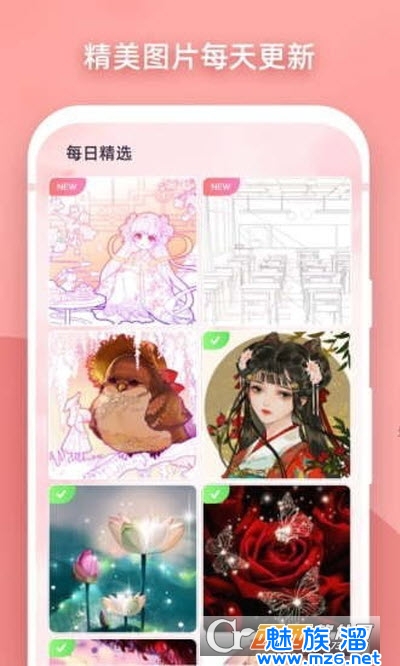 梦幻涂色书是一款非常有趣的休闲绘画游戏,这款游戏玩法非常自由,玩家在游戏中可以给各种喜欢的图案上色,每一张照片都是精心挑选的,多种颜色供玩家使用,完成涂色后还能一键将图片保存起来,可设置成桌面壁纸,玩起来非常有趣轻松,每天还会有新的作品可以更新,感兴趣的朋友快来下载《梦幻涂色书》玩玩吧