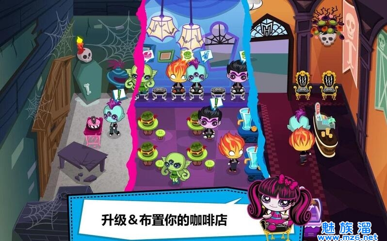 这次学校舞会有可能办不成,但是,Monster High的小鬼同学们当然不会袖手傍观。 Monster High并不像普通的高校,同学们都拥有各式各样的独特背景,像鬼魂,狼人,吸血鬼,还有海怪!没有Monster High不欢迎的同学,而所有同学们也一心希望舞会可以顺利举行!帮助小鬼同学们接管学校饭堂,把它打造成棒到吓人的咖啡店。我们需要整个团队的共同努力!加油!招募更多Minis来帮忙,不断升级你的咖啡店以招待更多客人!